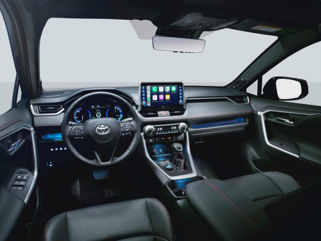 Poziționarea bateriei în podea nu a mâncat decât 60 litri din cei 560 litri pe care îi avea un portbagaj de RAV4 normal, cei 520 rămași fiind mai mult decât suficienți. Versiunea europeană a lui RAV PHEV va putea fi recunoscută prin noile bare față/spate, după vopseaua în două nuanțe sau după jantele de 18 sau 19″. Dintr-un motiv sau altul, japonezii au ales un set de scaune sportive pentru acest model, dar măcar avem scaune față/spate încălzite, hayon acționat electric, plafon panoramic, head-up display sau sistem de infotainment cu ecran tactil de 9″, compatibil cu Apple CarPlay și Android Auto.
