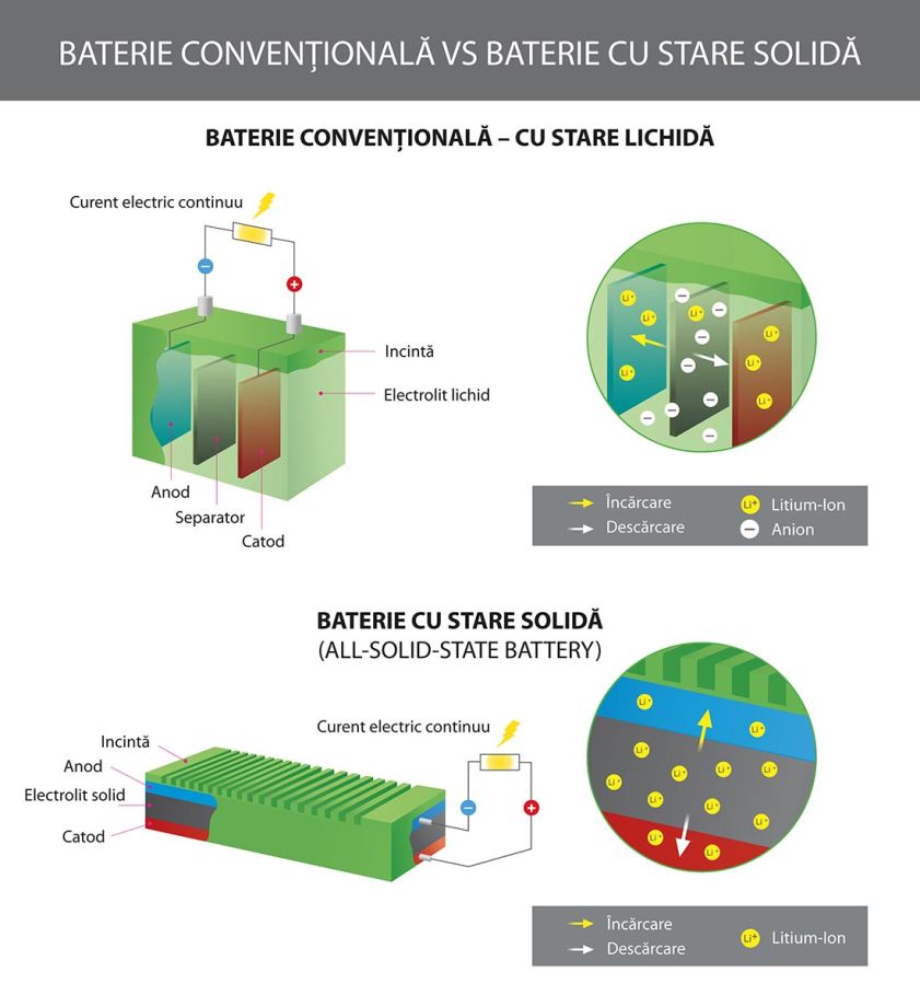 • O baterie litiu-ion este compusă din catod, anod, separator și electrolit. O baterie litiu-ion (de tipul celor folosite în prezent în smartphone-uri, scule electrice și vehicule electrice) folosește o soluție lichidă de electroliți. De cealaltă parte, o baterie cu stare solidă folosește electrolit solid, nu lichid, iar electrolitul solid joacă și rolul separatorului.