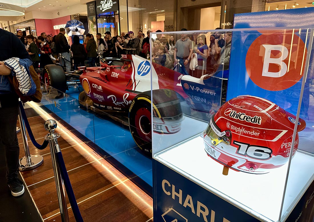 Vei găsi logoul brandului românesc atât pe mașină, cât și pe căștile celor doi piloți, expuse la rândul lor: cască roșie pentru Charles Leclerc, galbenă pentru Lewis Hamilton.