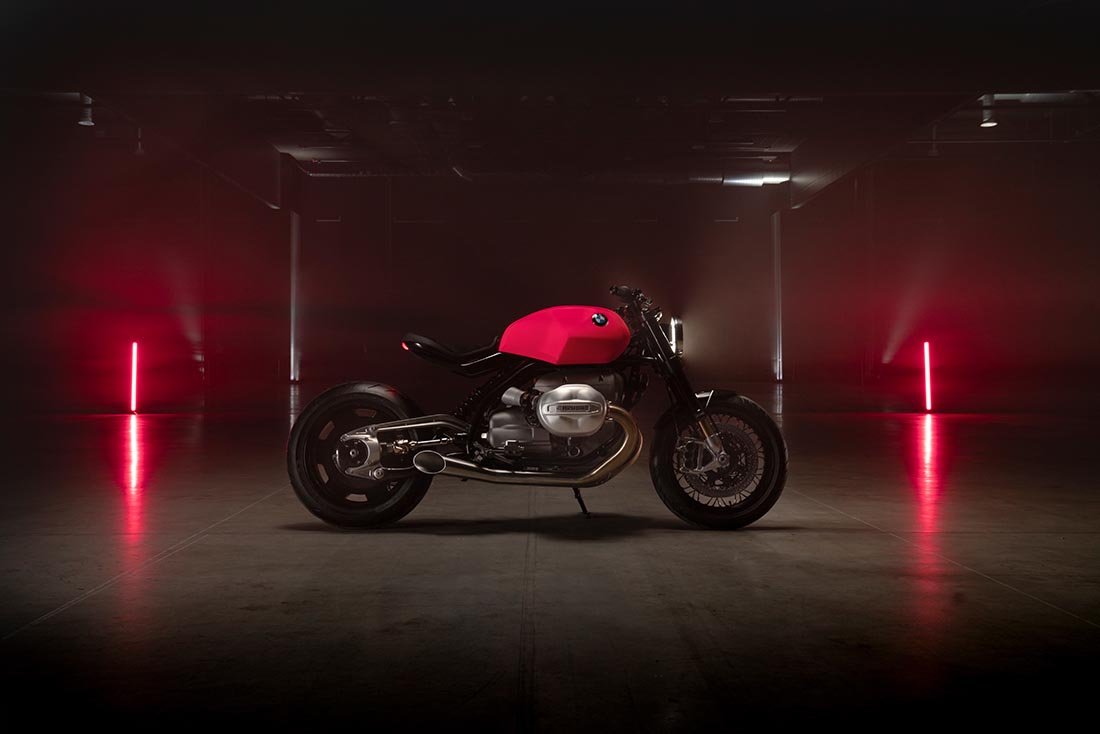 Evident este rezervorul roșu, despre care BMW spune că are o culoare progresivă „hotter than pinkl”, din anii 1970. Vedem și lampa spate frumos integrată în șaua lucrată cu talent, dar și farul prezentat sub forma unui inel din aluminiu imprimat 3D, cu lumini de zi integrate. Practic farul principal pare să plutească în mijlocul acestui inel cu lumini de zi – probabil unul dintre cele mai interesante detalii.