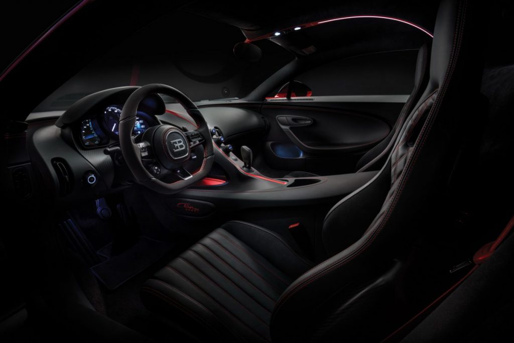 În cabină se regăsesc diferite embleme Chiron Sport, fie pe consola centrală, fie pe praguri, iar butonul de start și selectorul modurilor de rulare sunt finisate cu aluminiu eloxat negru, doar pentru că se poate.