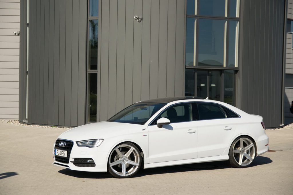 Este vorba despre Audi A3 Sedan căruia i-au adăugat jante de 20”, puțin exagerate, dar mașina arată bine cu ele. Jantele sunt completate de niște anvelope Continental ContiSportContact 6 cu dimensiunea de 235/30/20 și o suspensie ajustabilă KW ce coboară garda la sol a A3-ului cu până la 50 mm pe față și 45 mm pe spate.