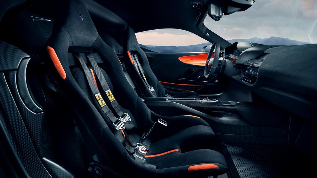 Discuri noi, plăcuțe noi, sistem eficientizat, asta înseamnă că SF 90 XX oprește de la 200 de km/h în 108 metri. Este genul de performanță care pune la treabă centurile în mai multe puncte de prindere, la fel cum scaunele gândite integral din carbon sunt puse la încercare de fiecare dată când iei viraje cu mașina asta. Îmi pot imagina cum îți vine să-ți verși mațele pe bord când o conduci, mai ales că citesc ce scrie în comunicatul de presă despre „vehicle dynamics” și văd că se completează perfect cu ce mi-au zis inginerii la prezentarea mașinii.