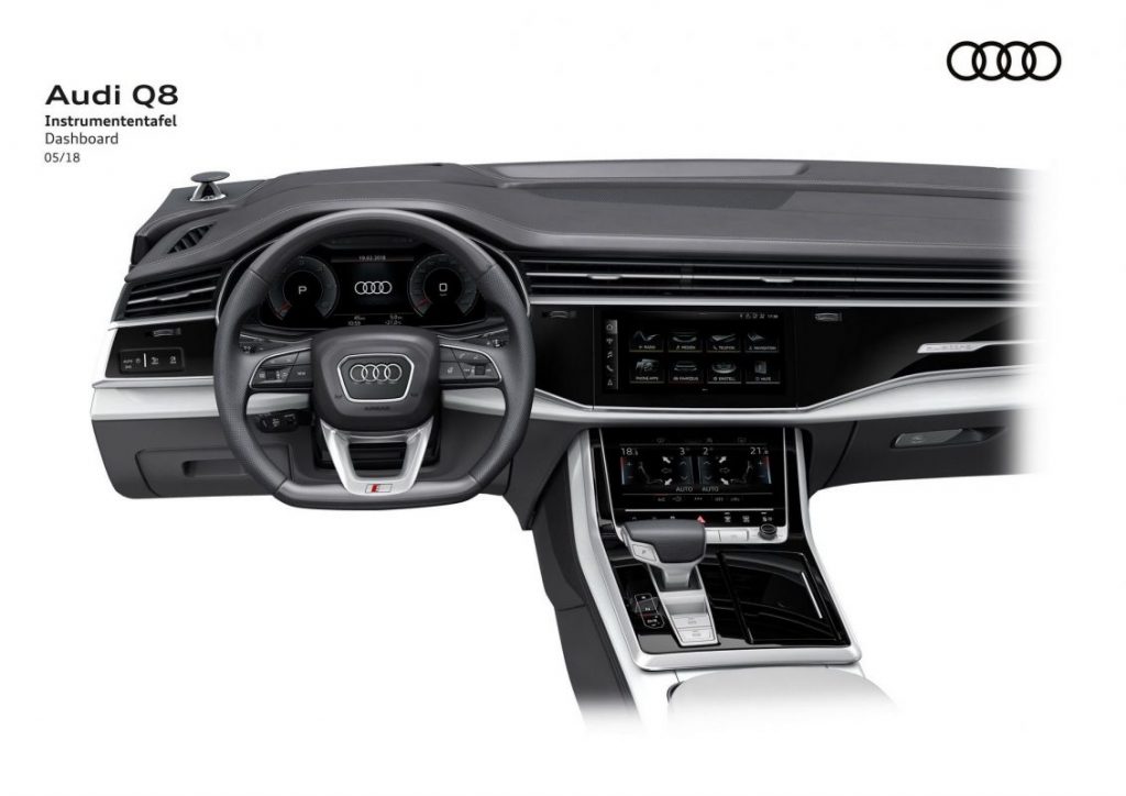 Interiorul seamănă cu cel de pe A6, A7, A8 sau Lambo Urus, dar asta se datorează layout-ului sistemului multimedia MMI cu ecran de 10.1” deasupra și 8.6” la bază, a cockpit-ului virtual cu ecran de 12.3” și a volanului preluat în totalitate de vărul din Bologna. Mai observăm sistemul de sonorizare Bang & Olufsen Advanced Sound System, iluminarea ambientală opțională, emblema quattro de pe bord, scaunele contour opționale, electrice, ventilate și cu funcție de masaj, sistemul de climatizare automat pe patru zone și noul schimbător de viteze destul de lat. Ce mă frapează pe mine este că Audi a ales să prezinte exteriorul noului Q8 într-o nuanță caldă, dar interiorul l-au făcut gri și argintiu, destul de fad, părerea mea.
