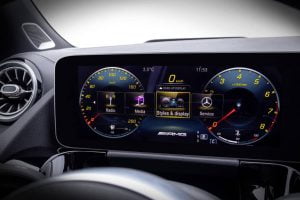 Interiorul este aproape identic cu cel al noului GLB, însă mici diferențe precum bordul în dreptul pasagerului sau designul fețelor de uși ne amintesc faptul că designerii nemți nu au vrut să se culce pe o ureche, deși aveau o cabină desenată aproape perfect deja. Pasagerii vor sta mai sus cu 14 cm față de Clasa A și cu 5 cm mai sus decât Clasa B, iar aspectul practic este ajutat de bancheta standard rabatabilă 40:60 sau cea opțională rabatabilă 40:20:40. Comenzile, butoanele, volanul și sistemul de infotainment MBUX sunt toate împărțite între cele opt reprezentante Benz ale segmentului compact.