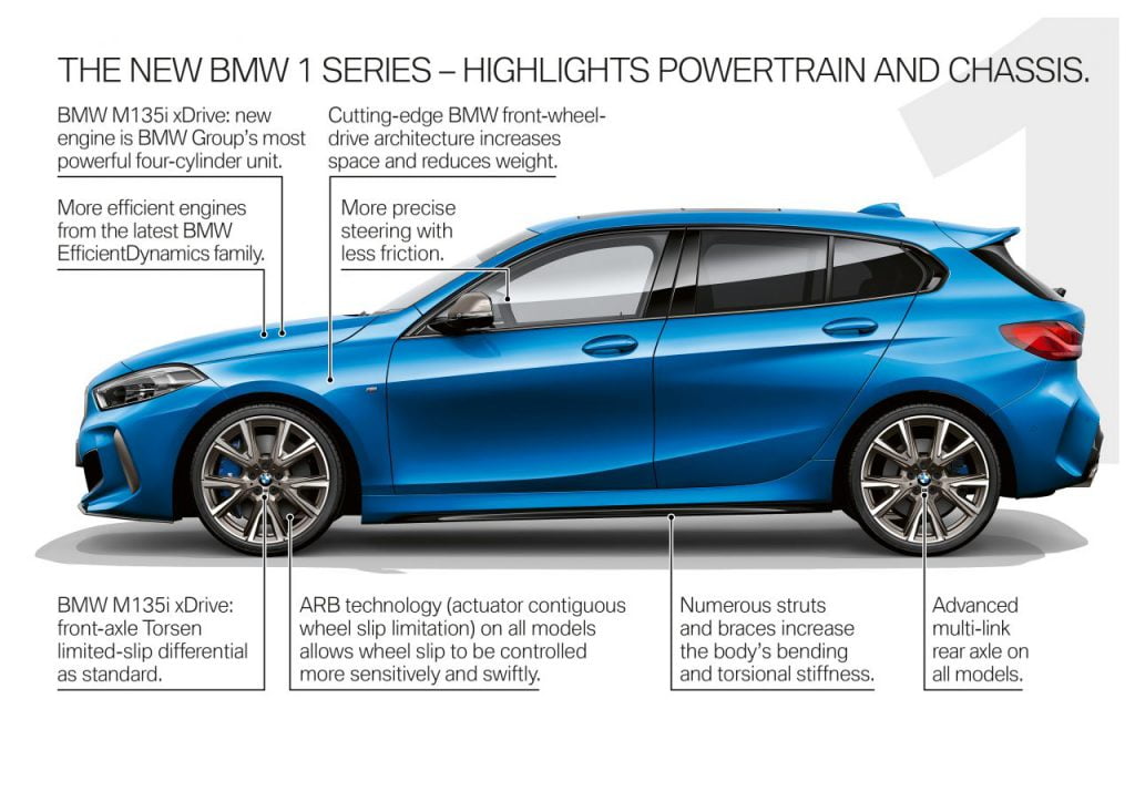 BMW folosește arhitectura sa cu tracțiune față de câțiva ani buni cu succes pe modele perecum X1, X2, Seria 2 Active Tourer și Gran Tourer. Nu era niciun secret faptul că noua Seria 1 o va folosi, China primind deja o Seria 1 Sedan (F52) cu punte motoare față și motoare amplasate transversal.