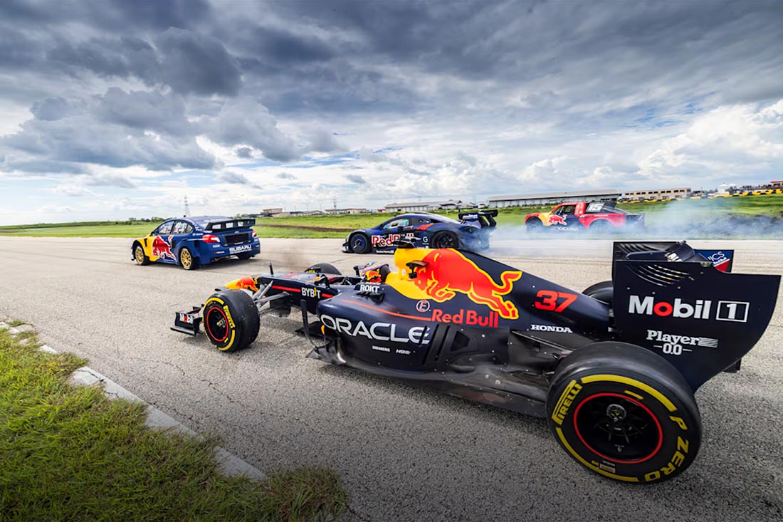 Cineva la Red Bull se întreabă: „Cine ar câștiga într-o cursă roată la roată între o mașină de F1, o mașină de Rallycross, o mașină Drift Hypercar și un camion Pro4?”.