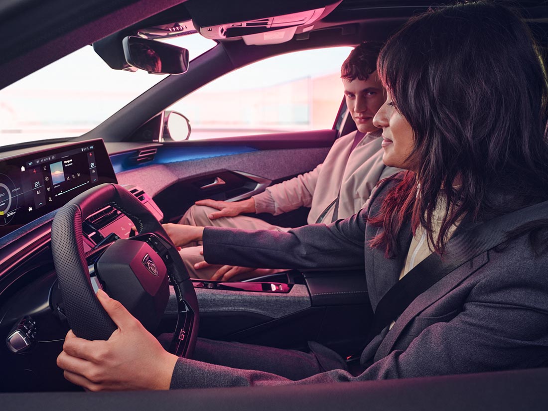 Selectorul de viteze a fost mutat de pe consola centrală pe bord, lângă butonul start-stop, lucru care pare să amplifice senzația de spațiu în față. Volanul mic – deja un element de identificare Peugeot – este redesenat și are comenzi noi, cu moduri îmbunătățite de detectare a degetelor și funcționare, conform comunicatului oficial. Există și două clapete noi în spatele lui, pentru controlul celot trei niveluri ale frânării regenerative.