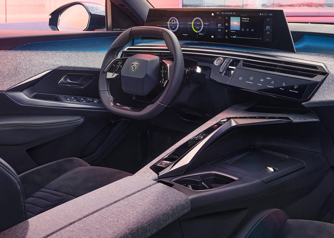 Selectorul de viteze a fost mutat de pe consola centrală pe bord, lângă butonul start-stop, lucru care pare să amplifice senzația de spațiu în față. Volanul mic – deja un element de identificare Peugeot – este redesenat și are comenzi noi, cu moduri îmbunătățite de detectare a degetelor și funcționare, conform comunicatului oficial. Există și două clapete noi în spatele lui, pentru controlul celot trei niveluri ale frânării regenerative.