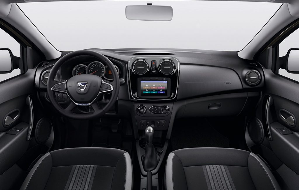 Interiorul compactelor primește climatizare automată, tapițerie în două nuanțe, cusături contrastante, numele Stepway brodat pe spătarele scaunelor, ramele gurilor de ventilație cromate și covorașe gri deschise.
