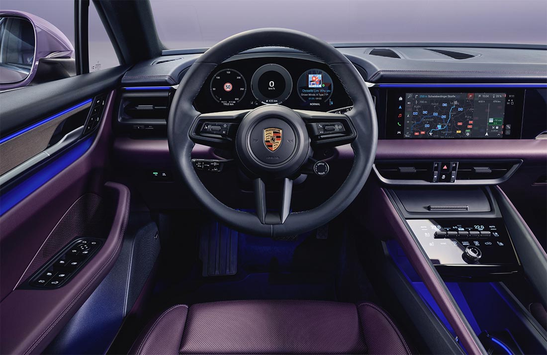 În interior se remarcă o organizare bună, cu linii simple. Designul drept al bordului amplifică lățimea percepută și ideea de spațiu, iar consola centrală ascendentă ar trebui să întărească senzația pasagerilor că sunt așezați mai jos – ei fiind pe bune așezați mai jos, în față chiar cu 28 mm mai jos decât în vechiul Macan.