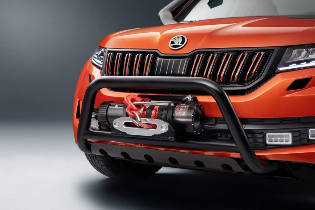 Sunset Orange este nuanța în care a fost prezentat pick-up-ul, iar interiorul continuă această temă prin cusăturile contrastante de pe scaunele din piele, prin pielea de pe volan, preșuri sau schimbătorul de viteze. Plafonul a primit logo-ul Skoda, băuturile vor rămâne mereu reci mulțumită frigiderului on-board, iar sistemului de infotainment Columbus i-au fost adăugate boxe de 320W, un amplificator de 2.000W și un subwoofer de 2.000W. Și pentru că doar ce m-am întors de la un training day de off-road, știu cât de folositoare sunt walkie-talkie-urile on-board atunci când ai nevoie de cineva să te ghideze în condiții dificile.