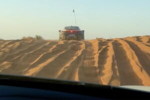 Prin dune rămâi înfipt imediat dacă nu ții mașina în mișcare, ocupată tot timpul – curaj să ai ca să apeși pedala chiar și atunci când nu vezi nimic peste o culme. Dacă însă sunt rafale de vânt și ridică praf sau nisip ușor, e chiar greu să mergi tare în formație. Sunt momente în care nu vezi mai nimic și numai gândul că poți scoate din uz o mașină atât de scumpă angajată într-un eveniment important parcă te trage de genunchi înapoi. E n-am mai blocat-o, dar au mai fost cazuri, toate din motive de reținere sau nepricepere. Mașina, cel puțin în deșert, rupe!