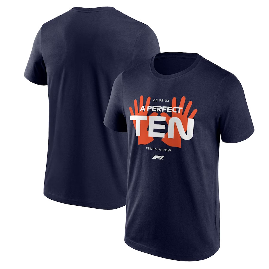 În magazinul online Formula 1 a apărut un tricou care ne lasă să marcăm această realizare. Două mâini – zece degete pentru 10 victorii consecutive (Miami 2023 – Monza 2023), cu una mai mult decât ceea ce reușise Vettel: 9 victorii în 2013.